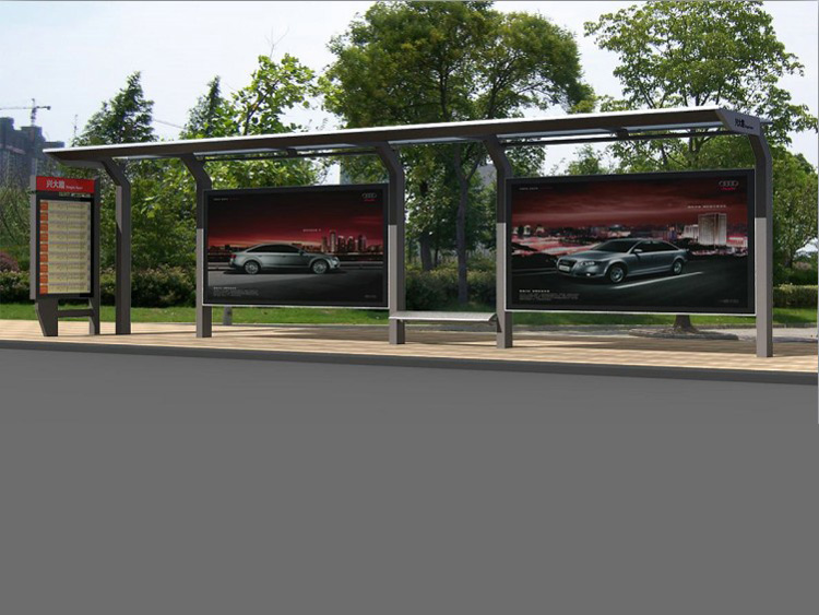 公交車候車亭一般是與公交站牌相配套的,為方便公交乘客候車時遮陽、防雨等,在車站、道路兩旁或綠化帶的港灣式公交停靠站上建設的交通設施。由于城市公交的日益發(fā)達,候車亭已發(fā)展成為城市一個不可或缺的重要組成部分,設計精美的候車亭也成為了城市一道美麗的風景。 一般候車亭棚體主要頂棚、立柱、頂弓、廣告燈箱和坐凳組成,也有用隔板來代替廣告燈箱的。