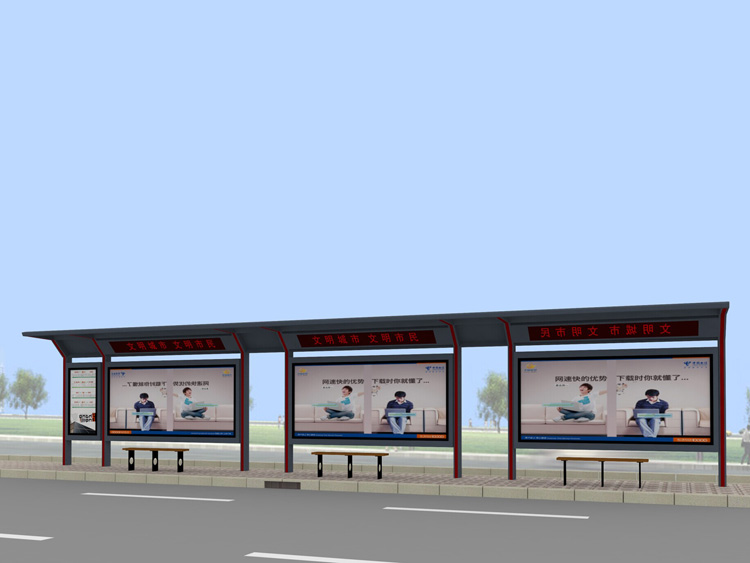 公交車候車亭一般是與公交站牌相配套的,為方便公交乘客候車時遮陽、防雨等,在車站、道路兩旁或綠化帶的港灣式公交停靠站上建設(shè)的交通設(shè)施。由于城市公交的日益發(fā)達,候車亭已發(fā)展成為城市一個不可或缺的重要組成部分,設(shè)計精美的候車亭也成為了城市一道美麗的風景。 一般候車亭棚體主要頂棚、立柱、頂弓、廣告燈箱和坐凳組成,也有用隔板來代替廣告燈箱的。